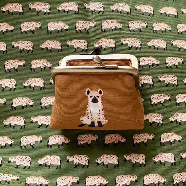 脚をくずして座っているブチハイエナ がま口を開けると内側ではヘソテンしています。 サイズ およそ 綿 100% 6.5×9×3cm 27.5g 7.5cm角 口金使用 ※1つ1つ手作業で制作しているため、色や形に若干、の違いが生じる場合がございますのでご了承ください。 ※お使いの端末や閲覧環境により、写真と実物の色味や質感が多少異なって見えることがございます。 ※プリントムラがある場合がございます。 ※口金は紙紐を使い接着剤で固定している為、洗濯出来ません。 ※水濡れ摩擦などで色落ちする可能性もございます。 ※犬と暮らしている自宅で制作しています。