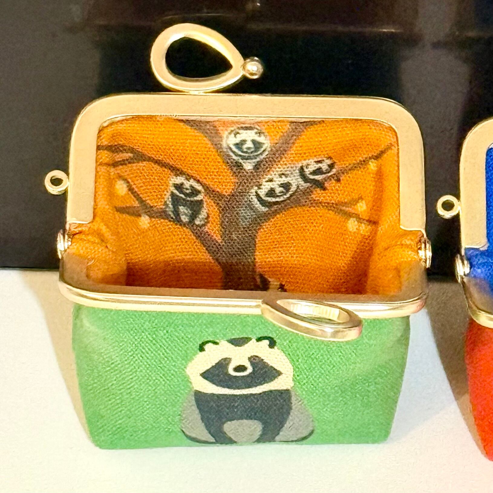 がま口を開くと木に登ったタヌキがいます(たぬ木)