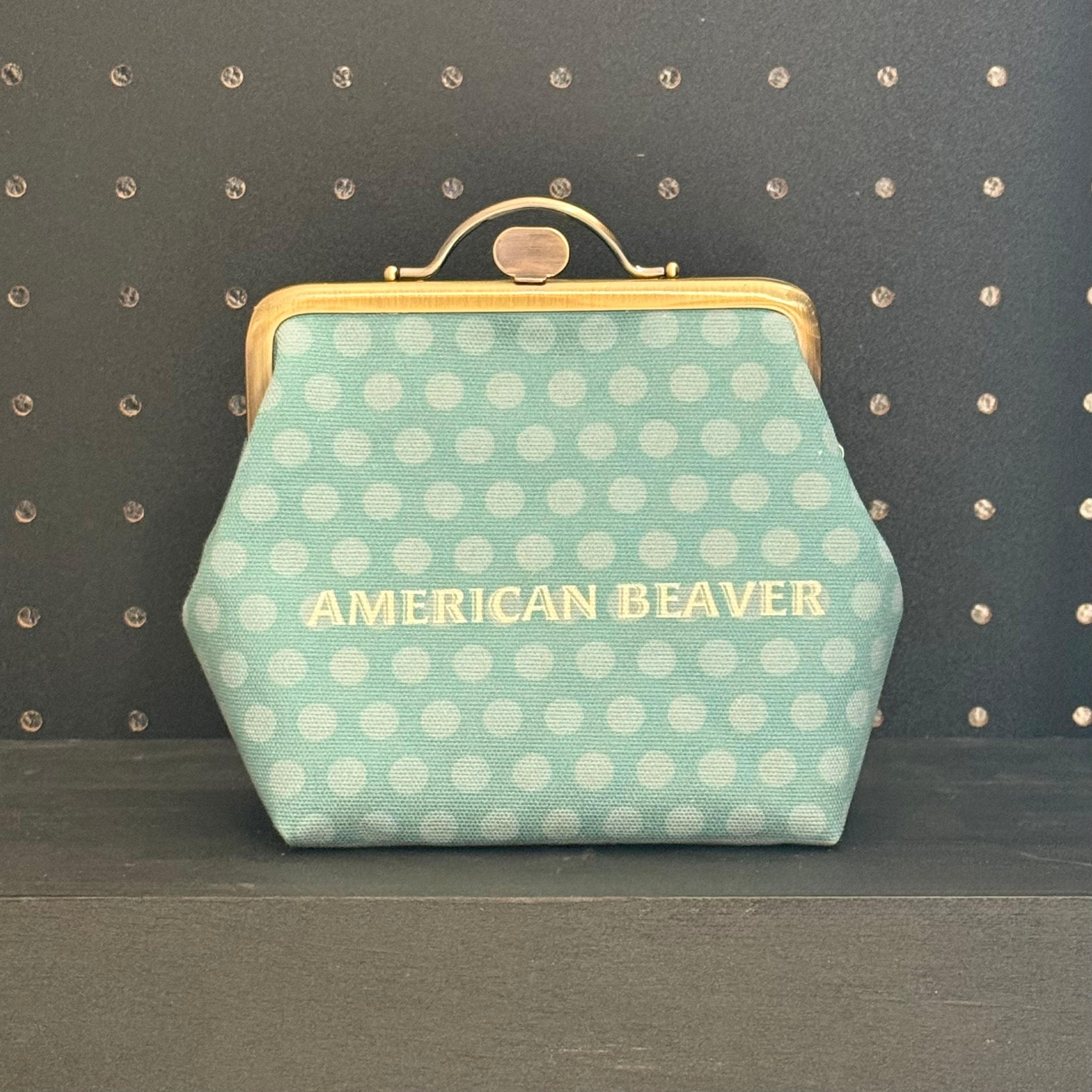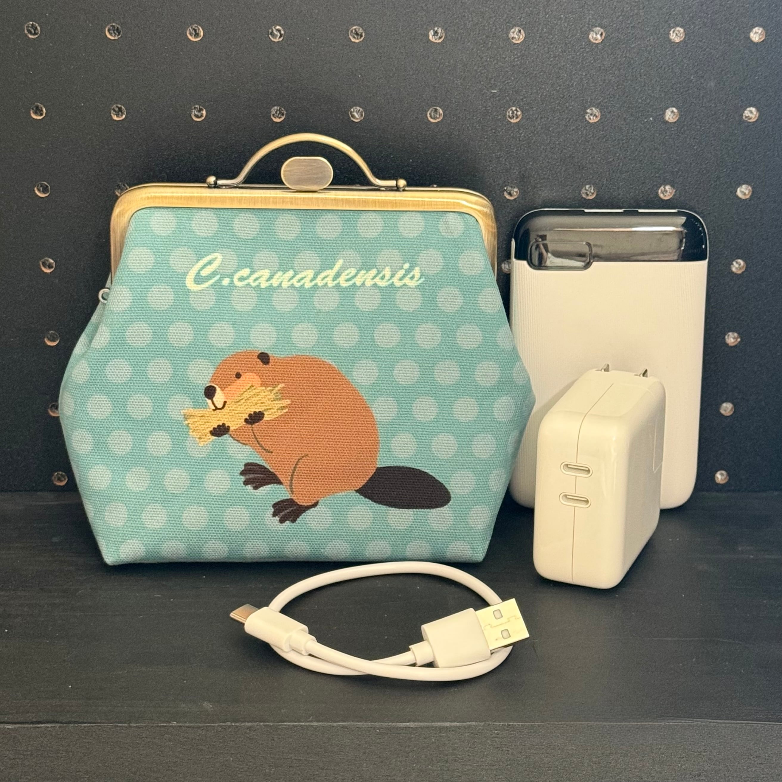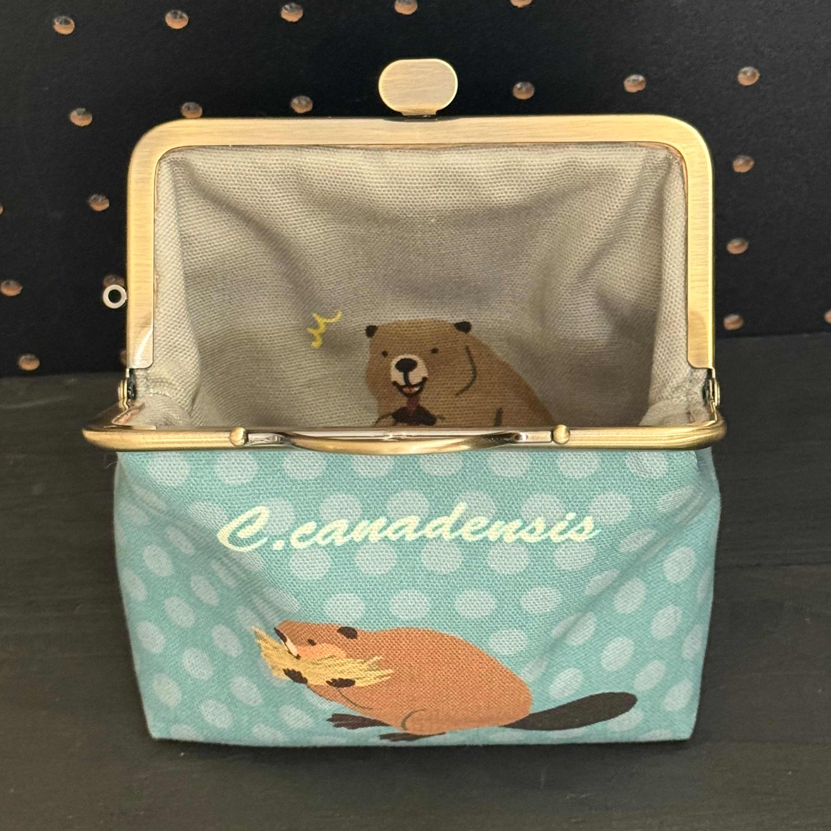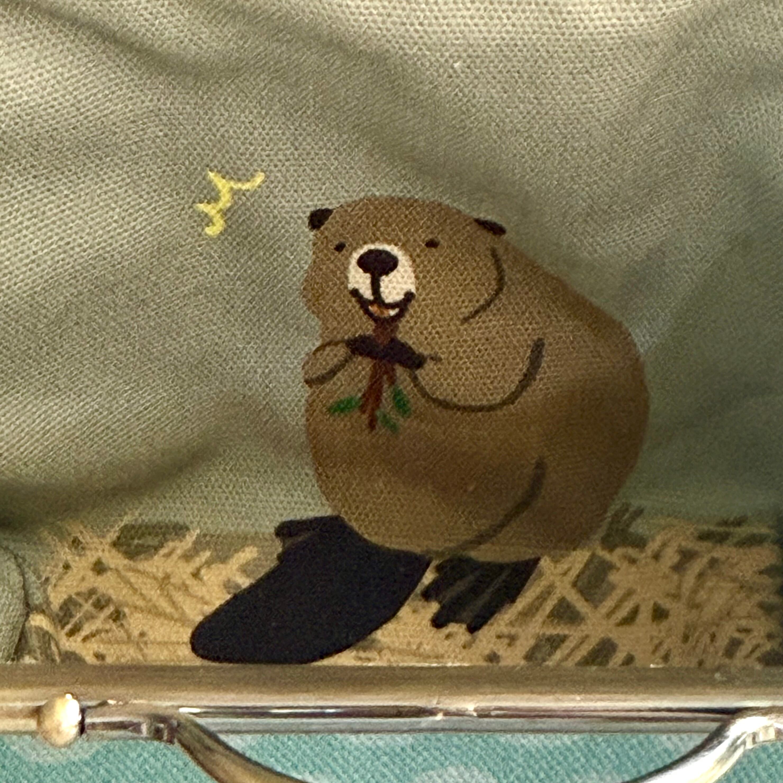 12cm角口金とオリジナルの布を使用したビーバーのがま口ポーチです