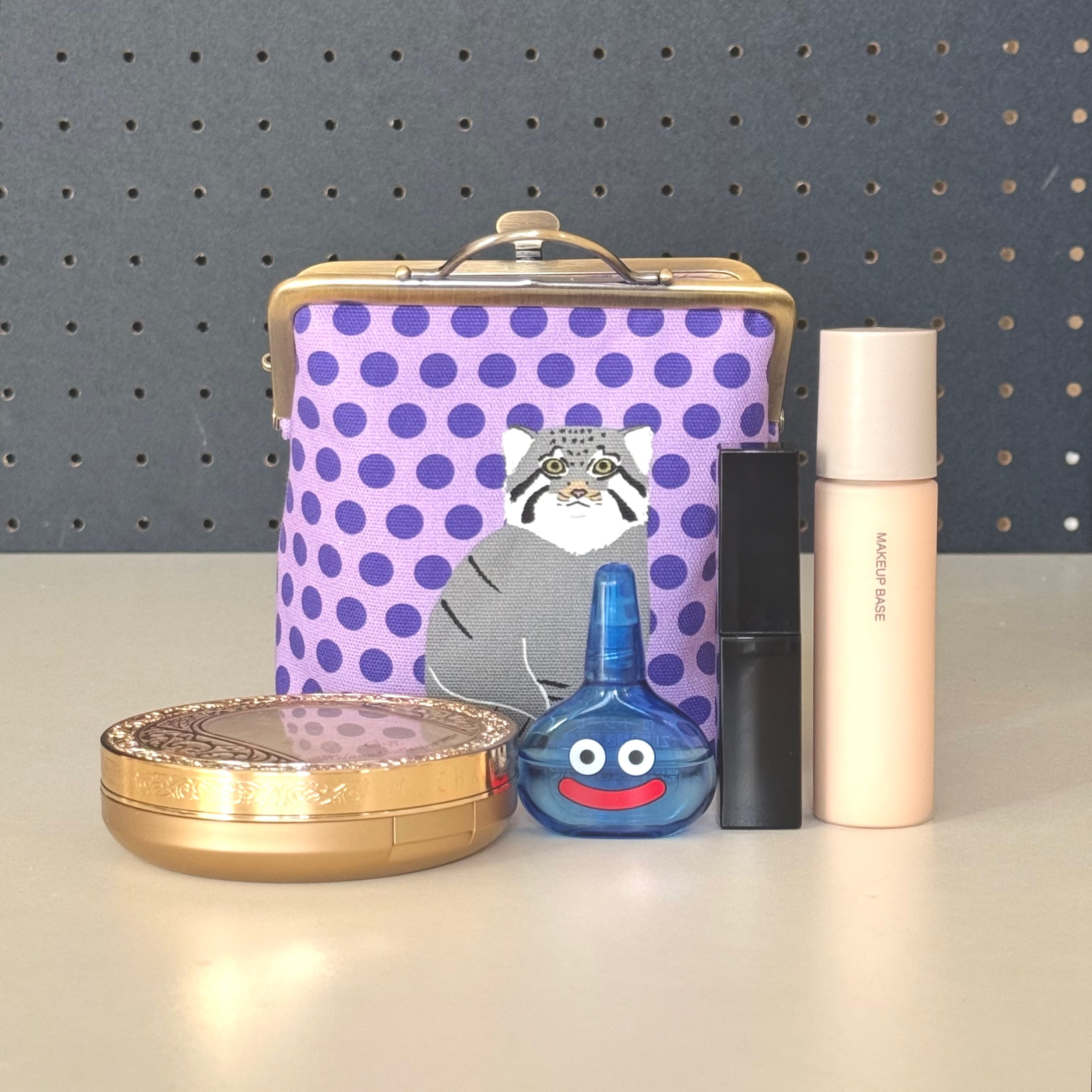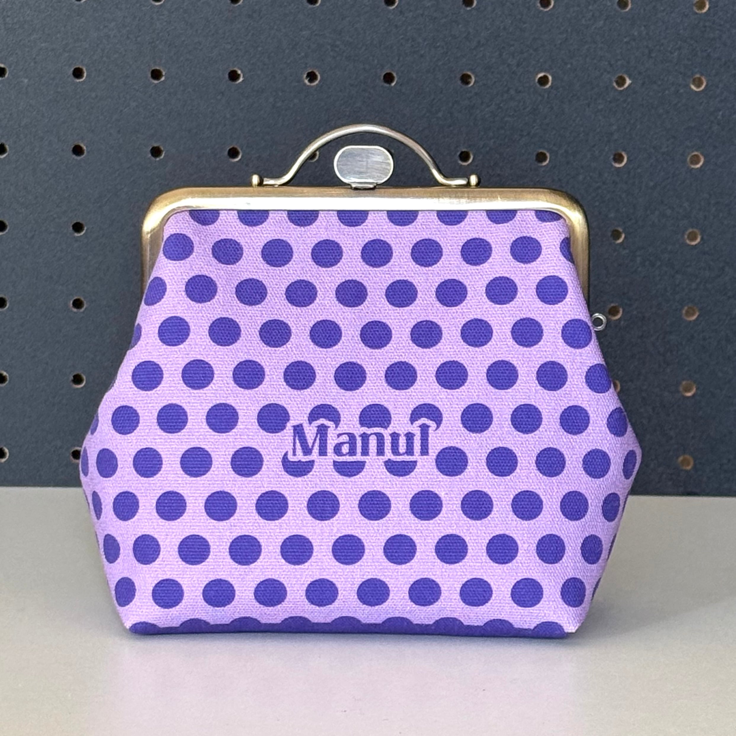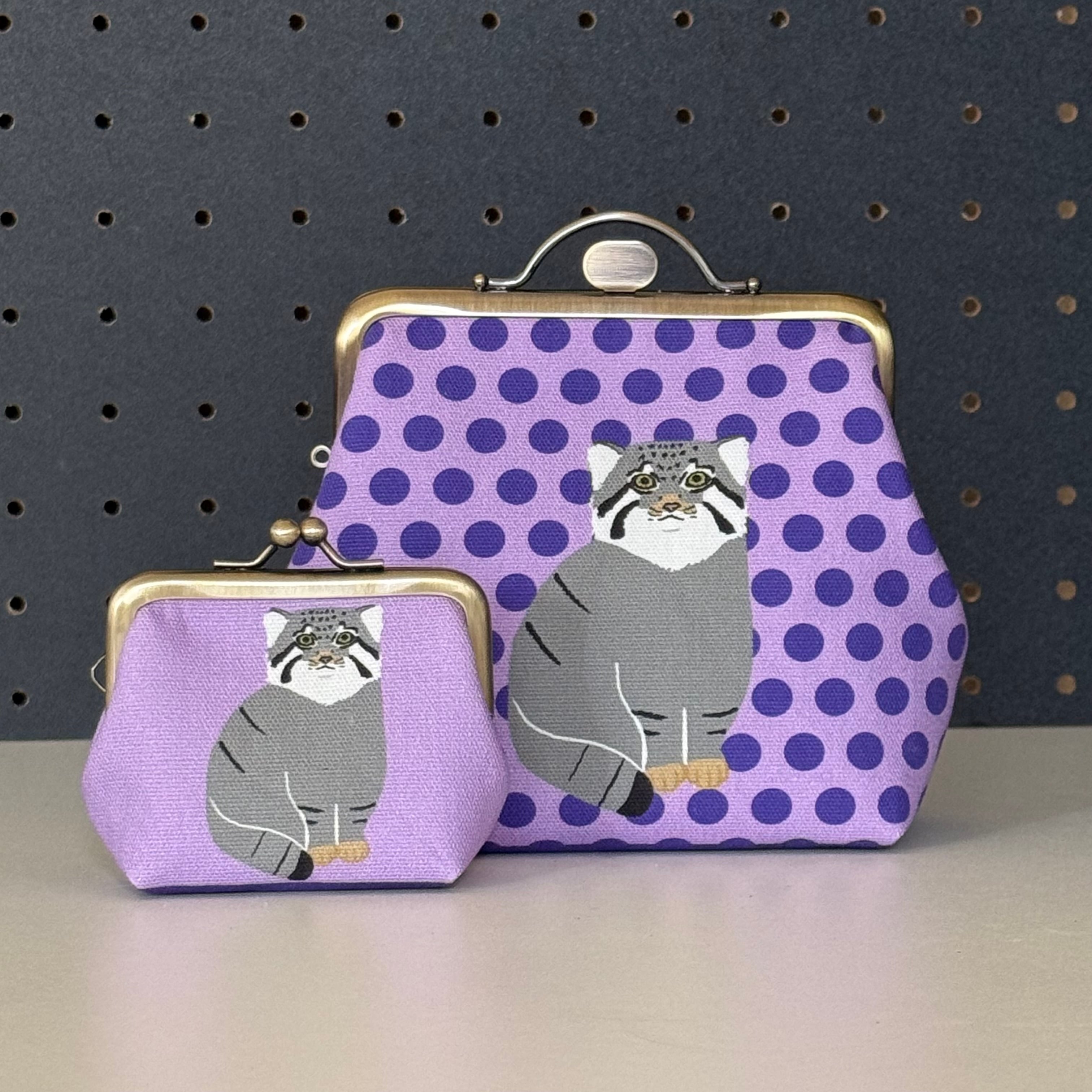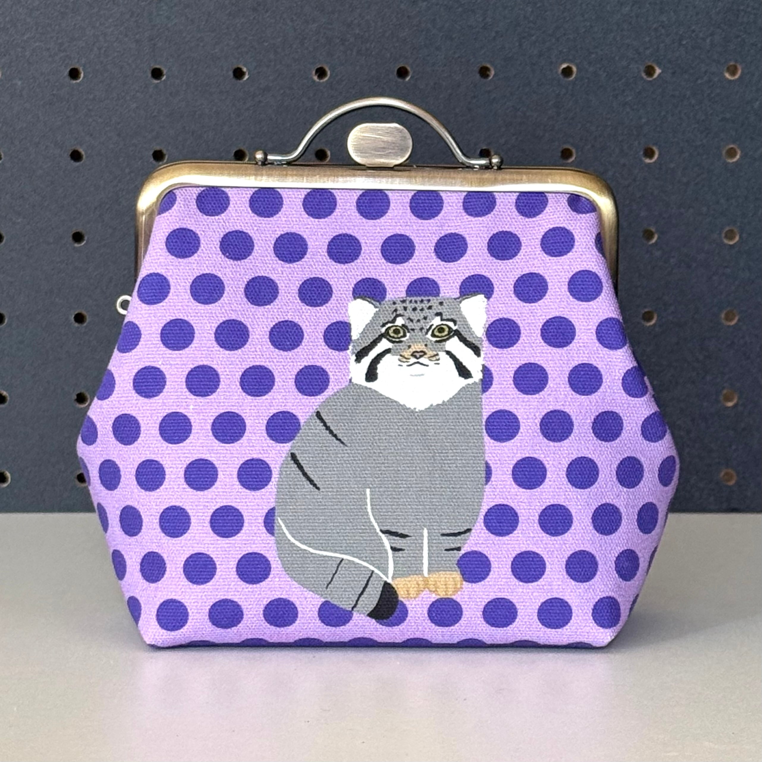12cm角口金とオリジナルの布を使用したマヌルネコのがま口ポーチです。