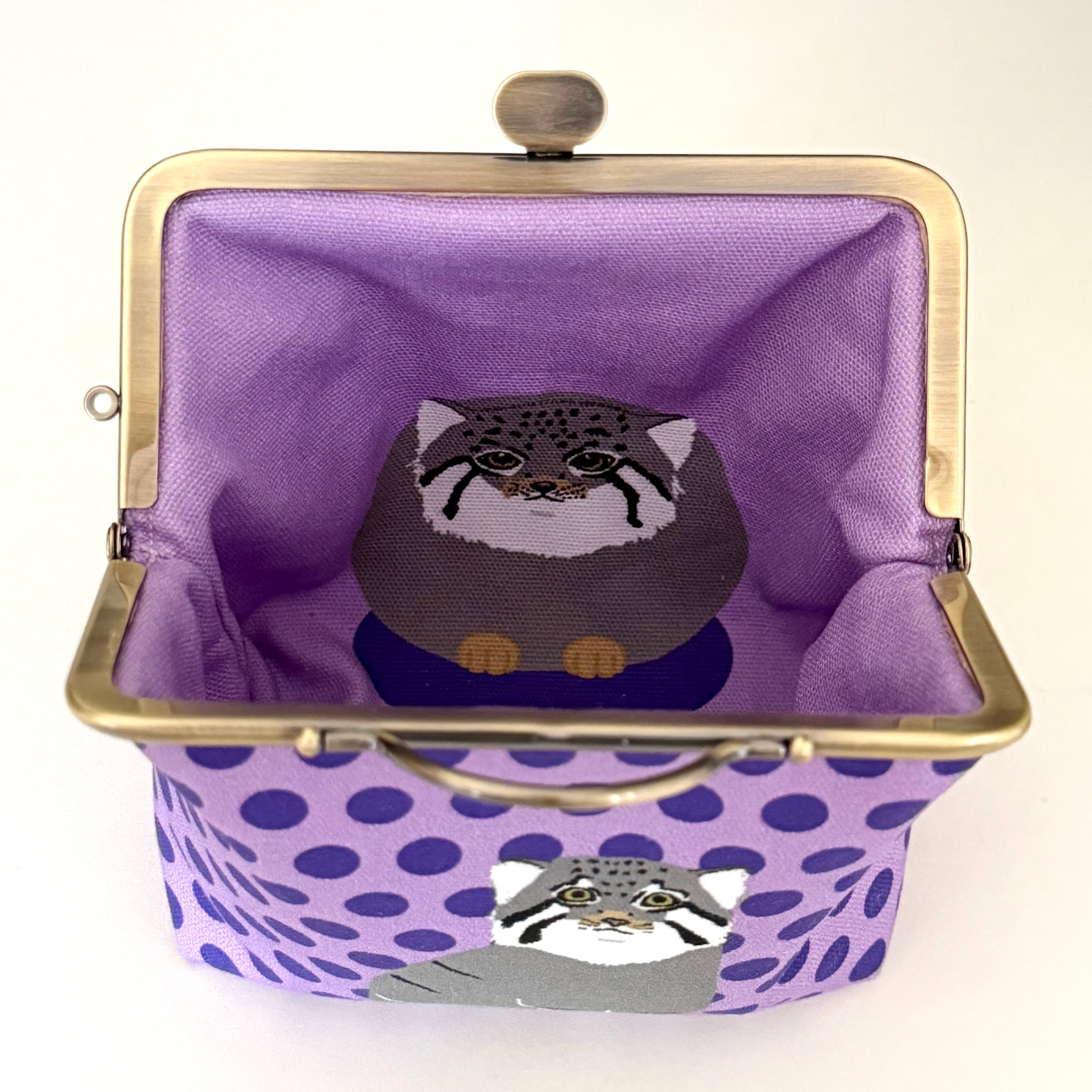 がま口を開けると丸くなったマヌルネコが底から見上げています。