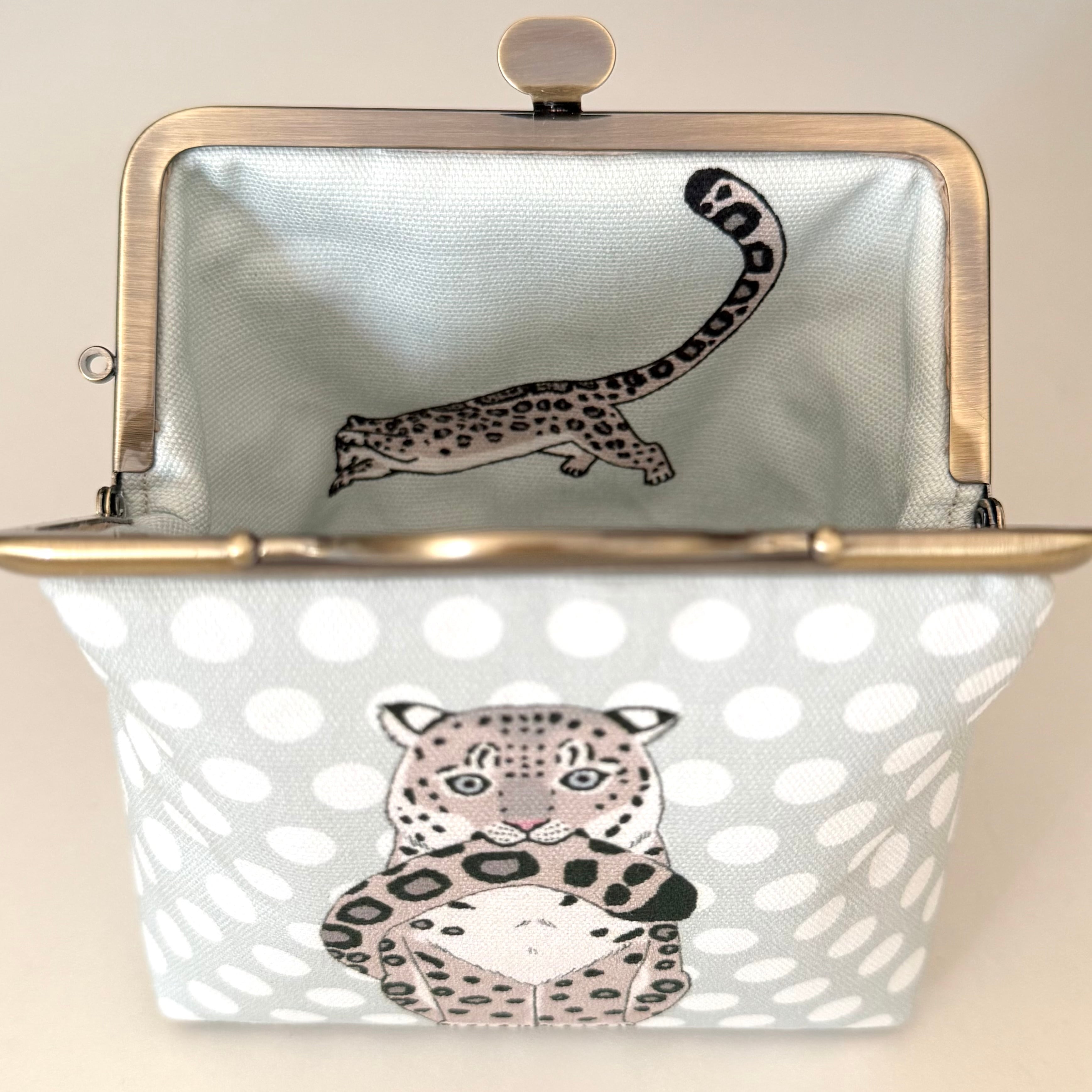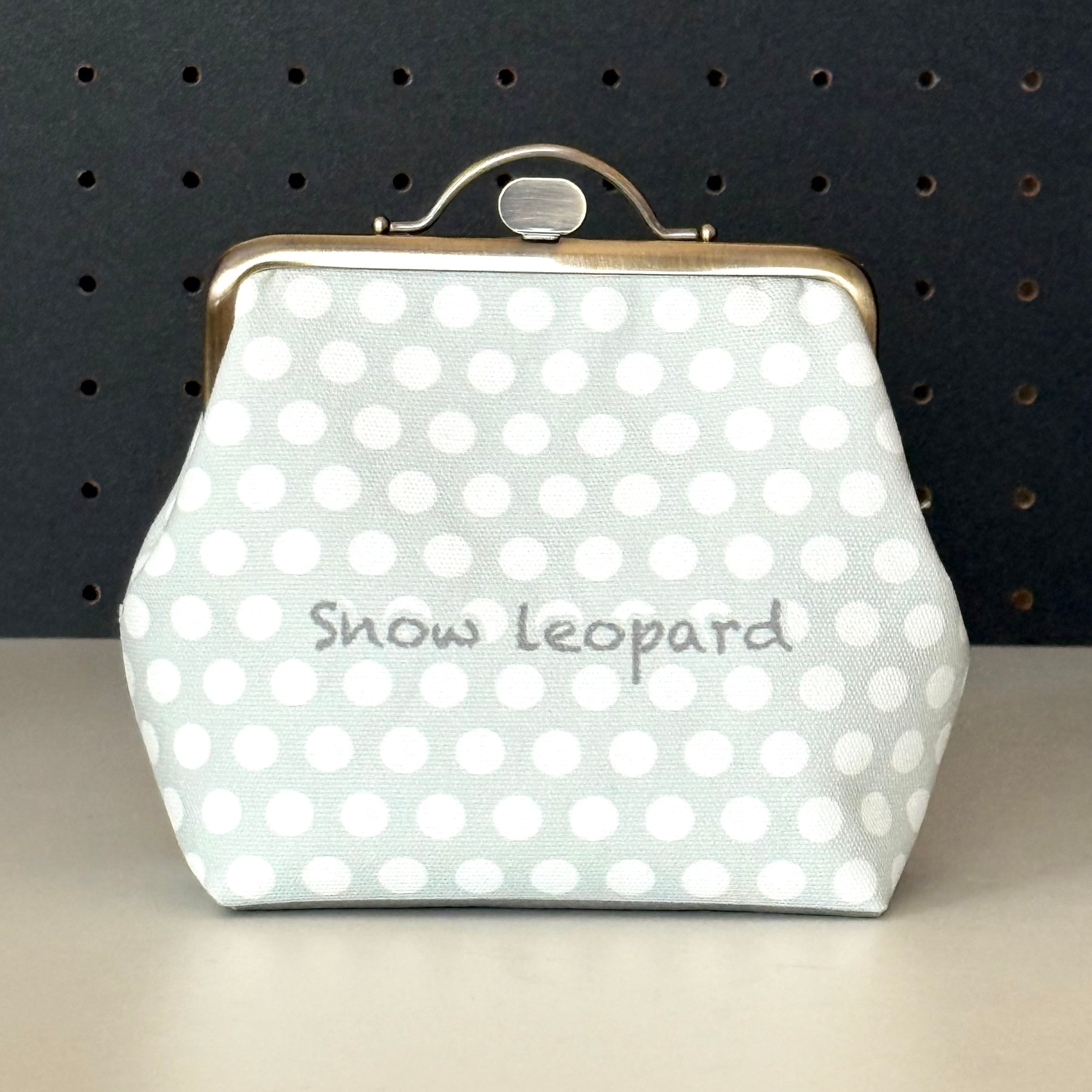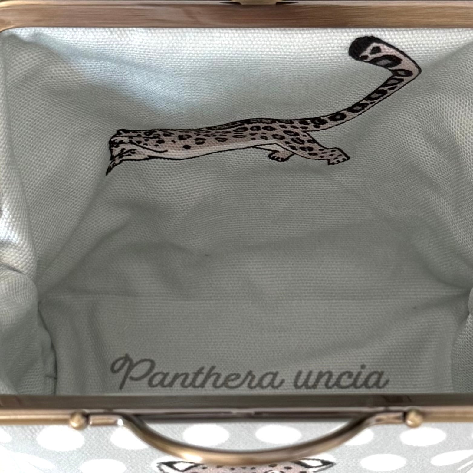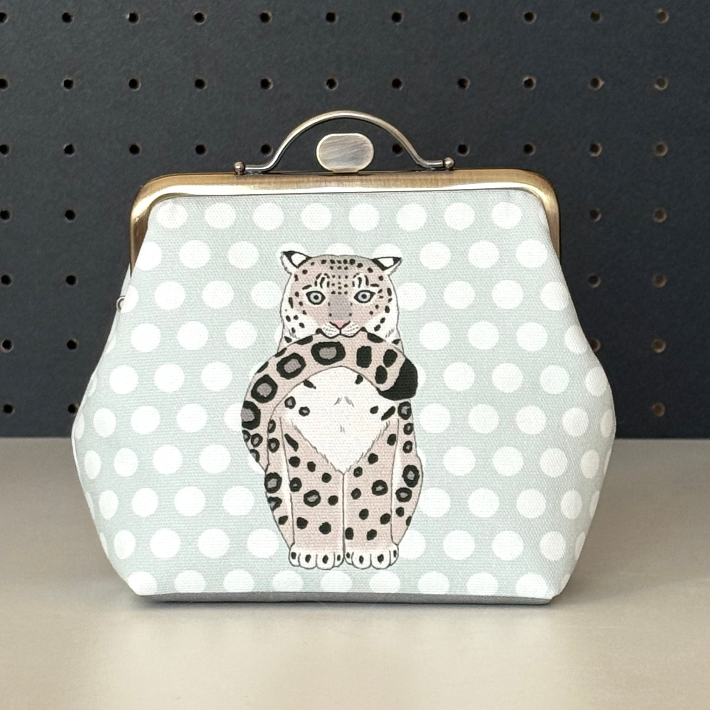 12cm角口金とオリジナルの布を使用したユキヒョウのポーチです。