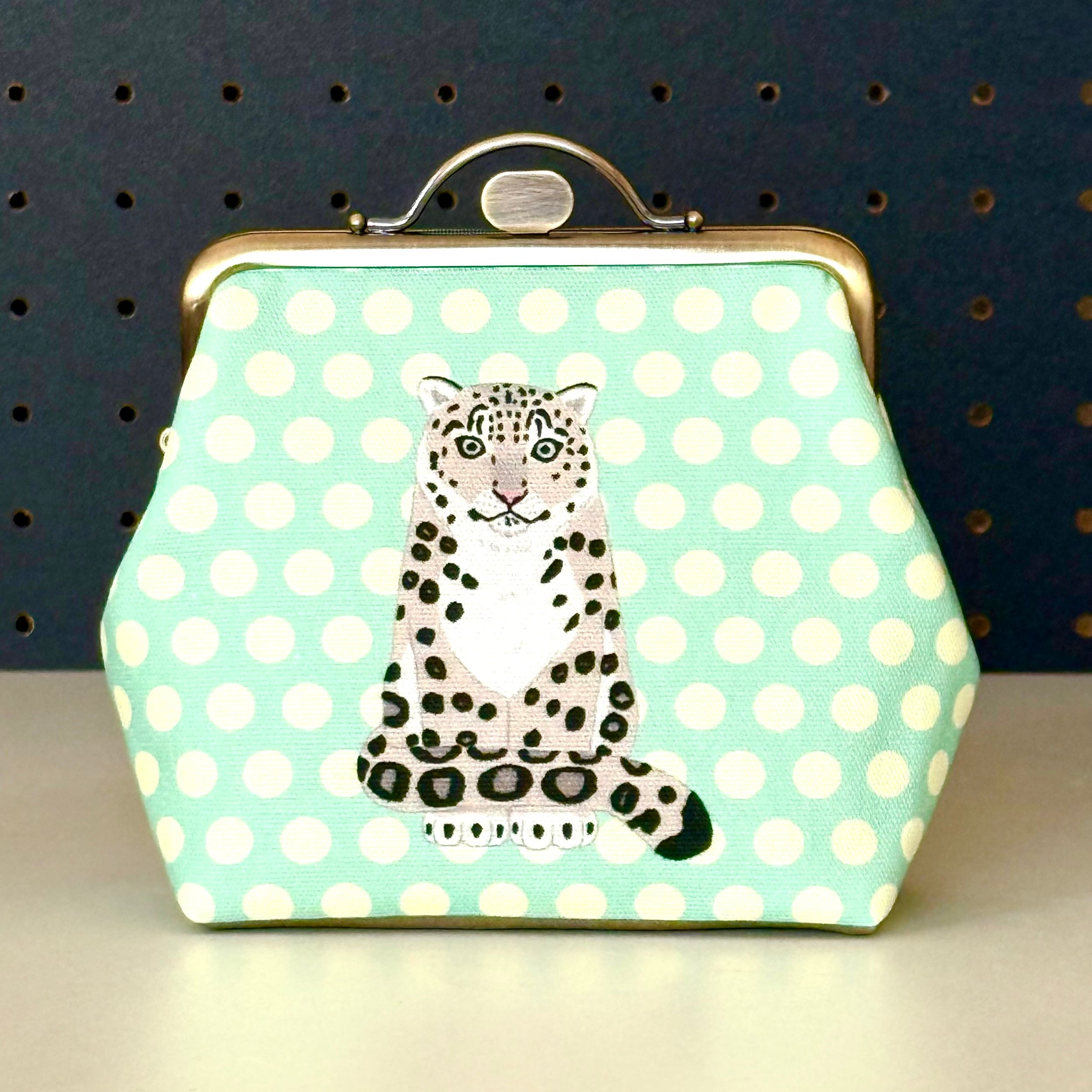 12cm角口金とオリジナルの布を使用したユキヒョウのがま口ポーチです。