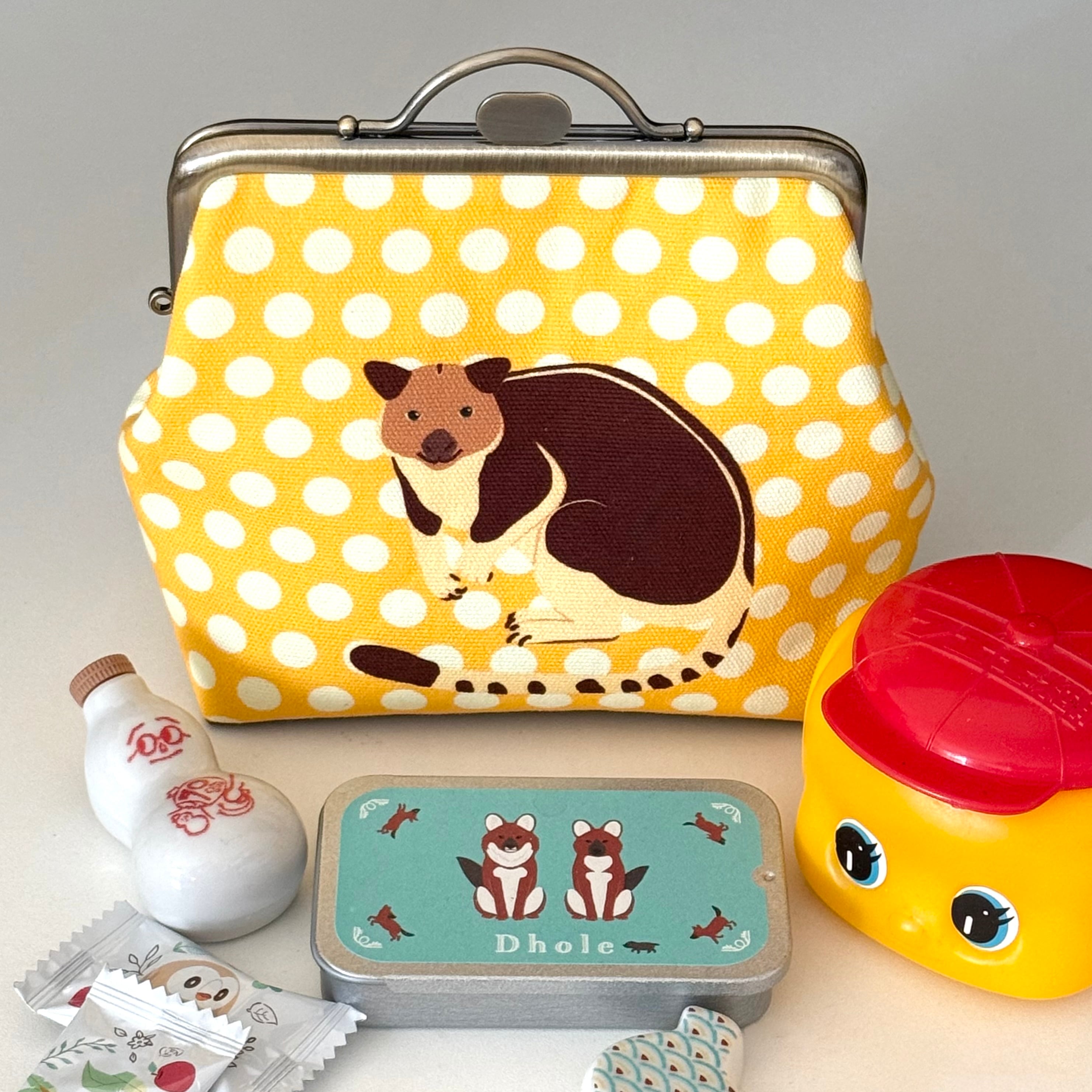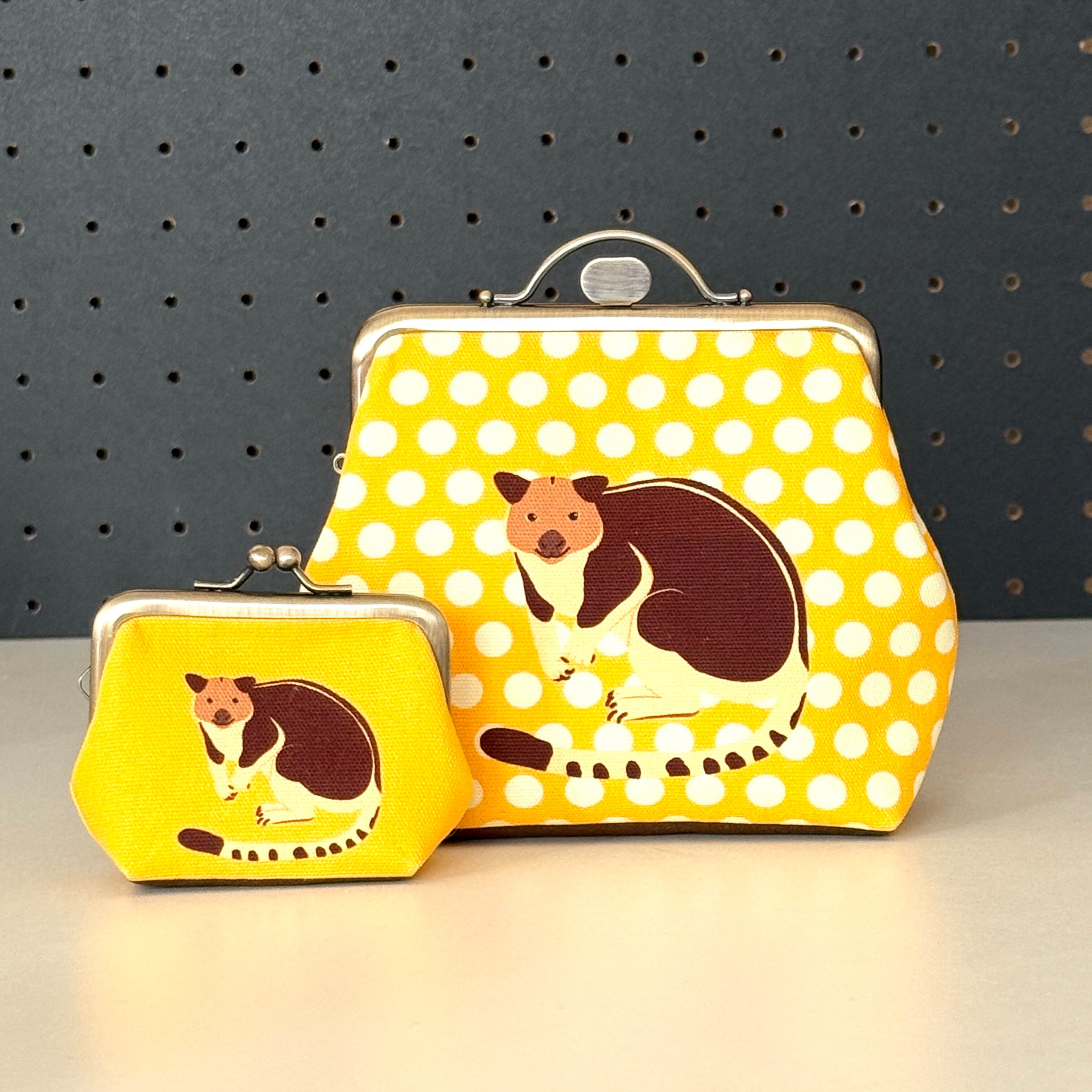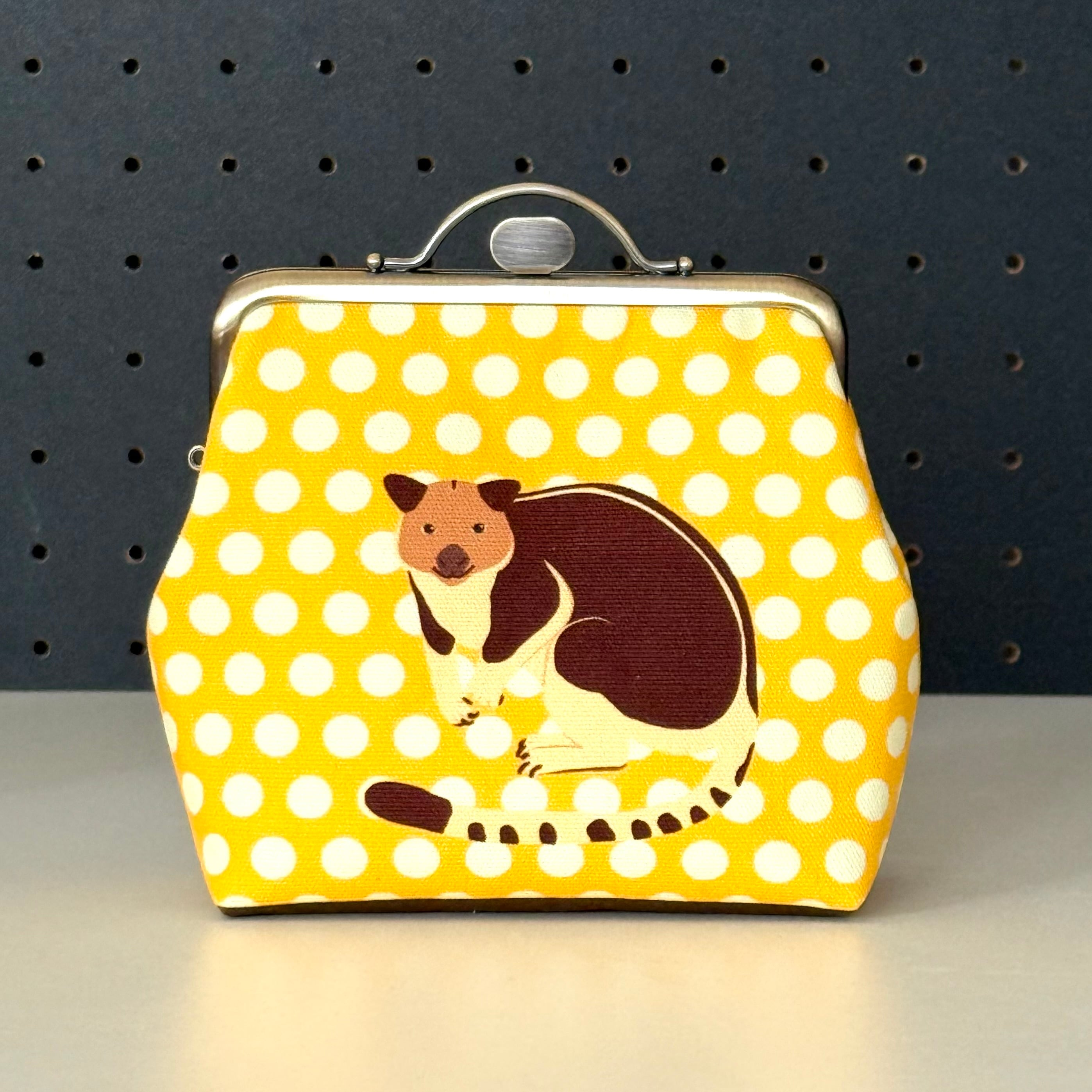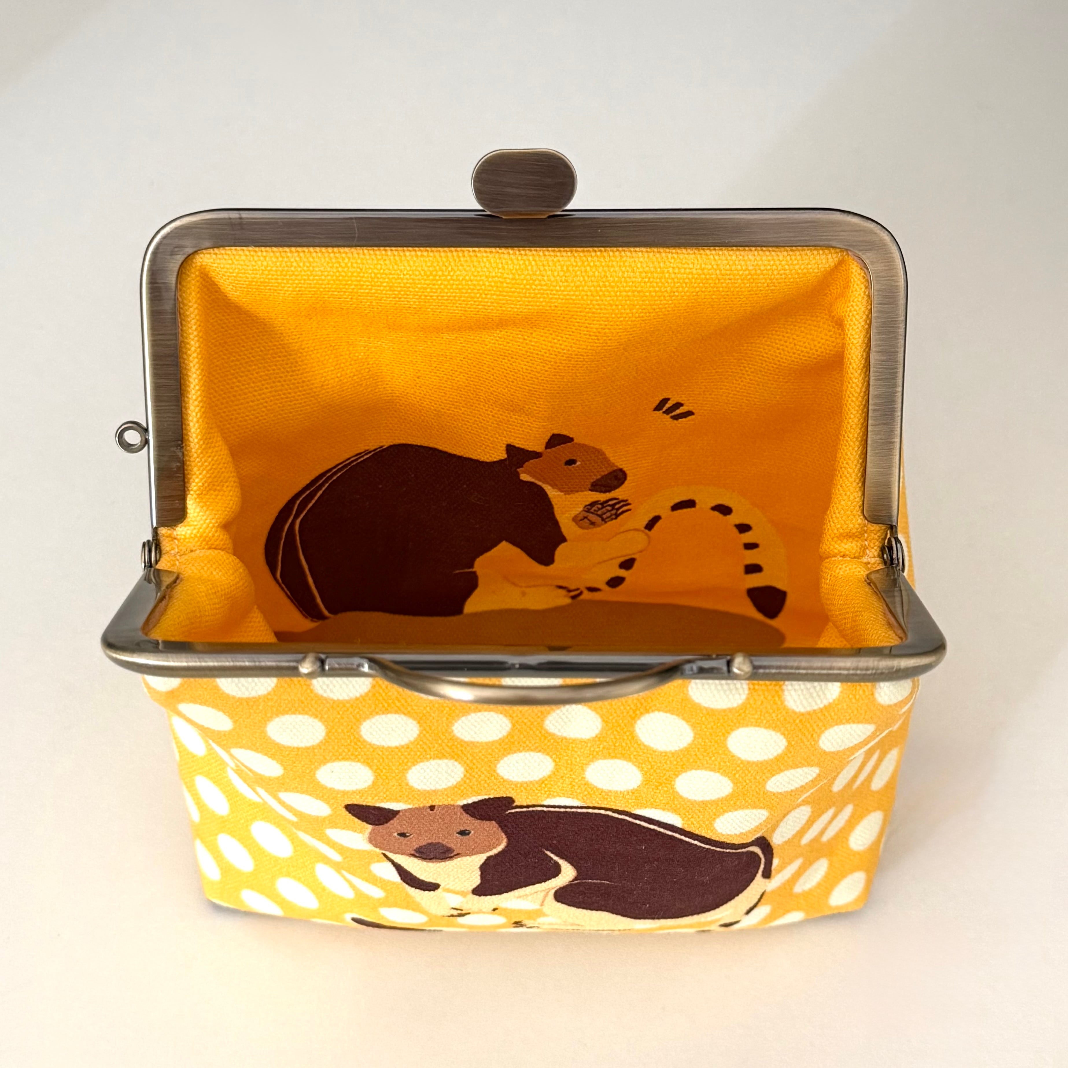12cm角口金とオリジナルの布を使用したセスジキノボリカンガルーのポーチです。