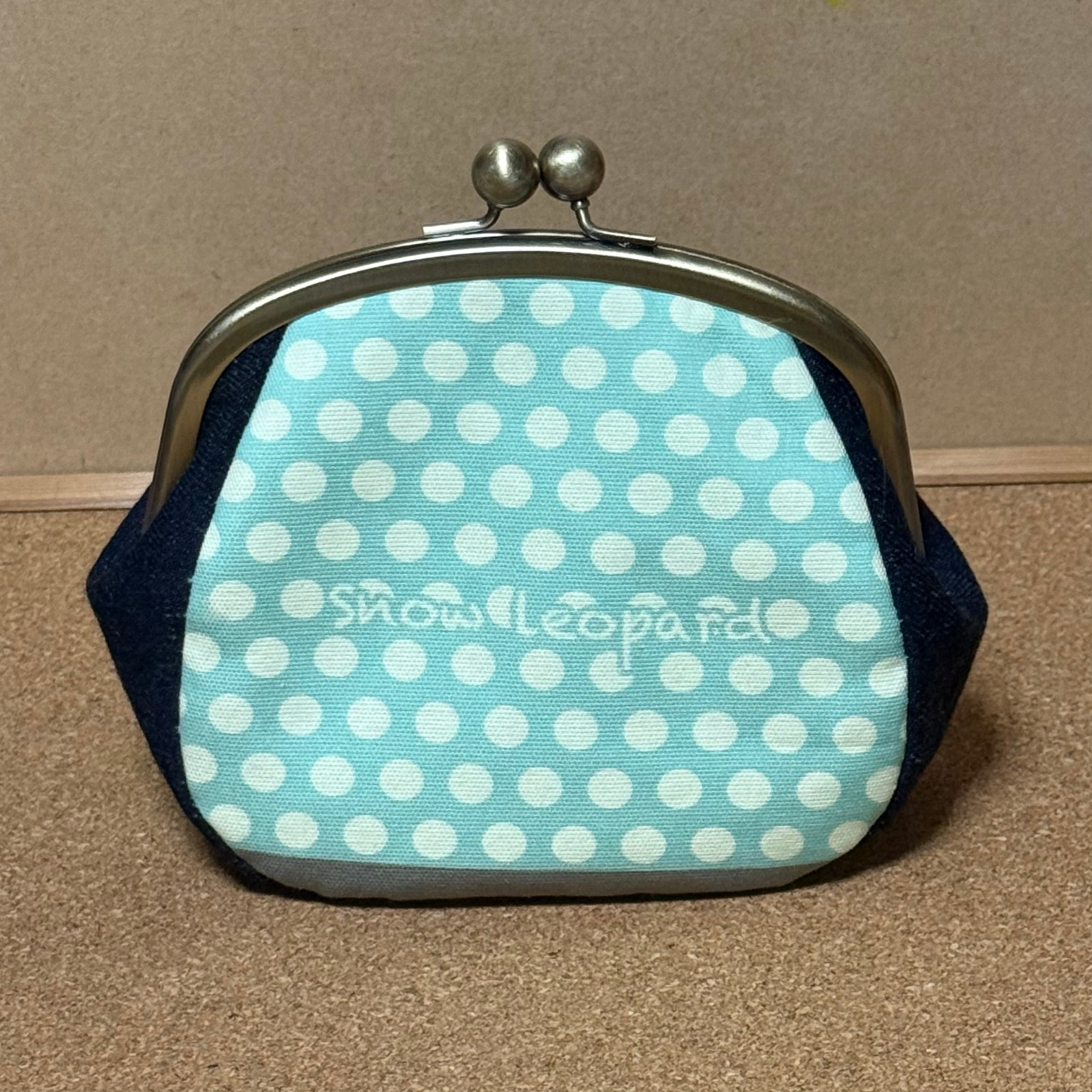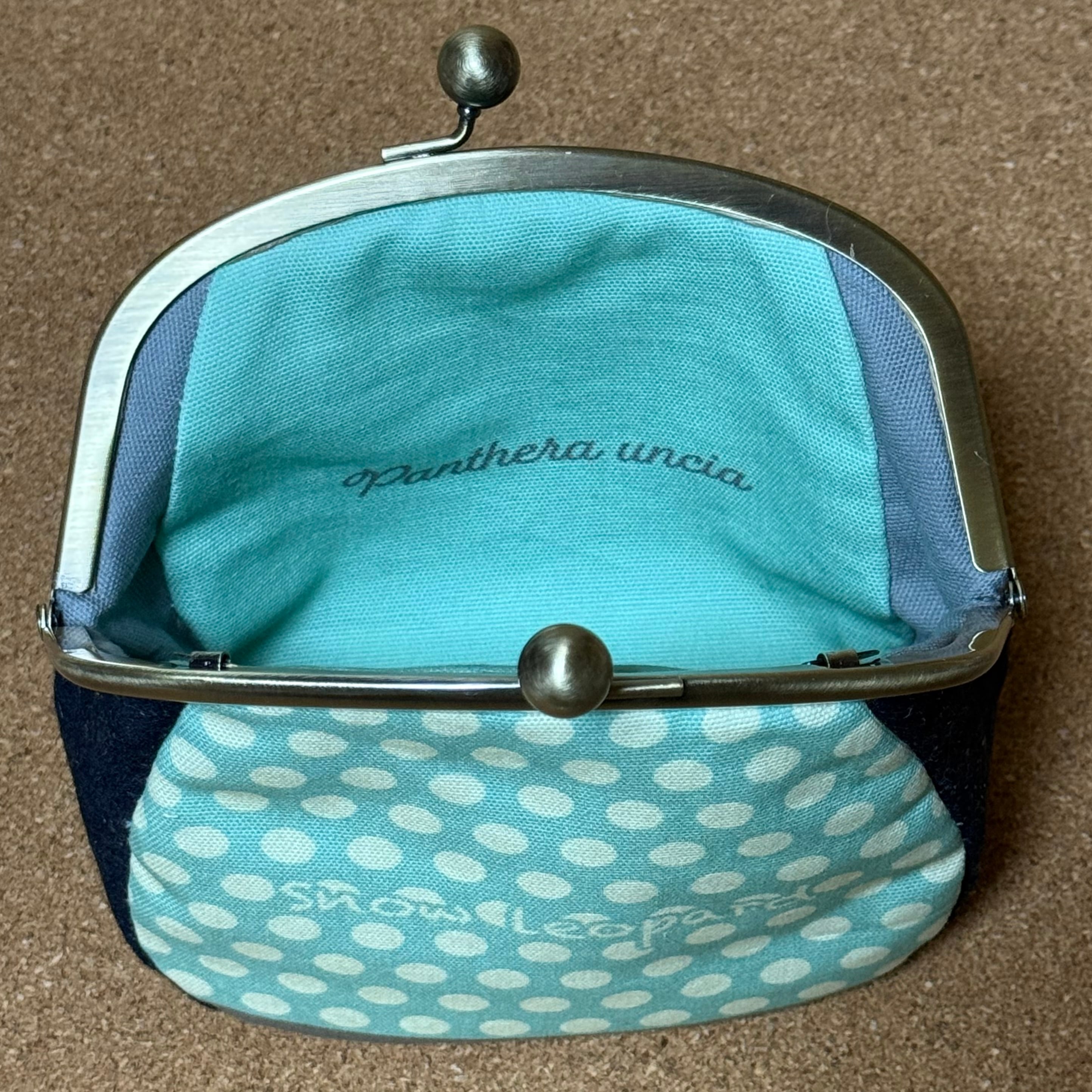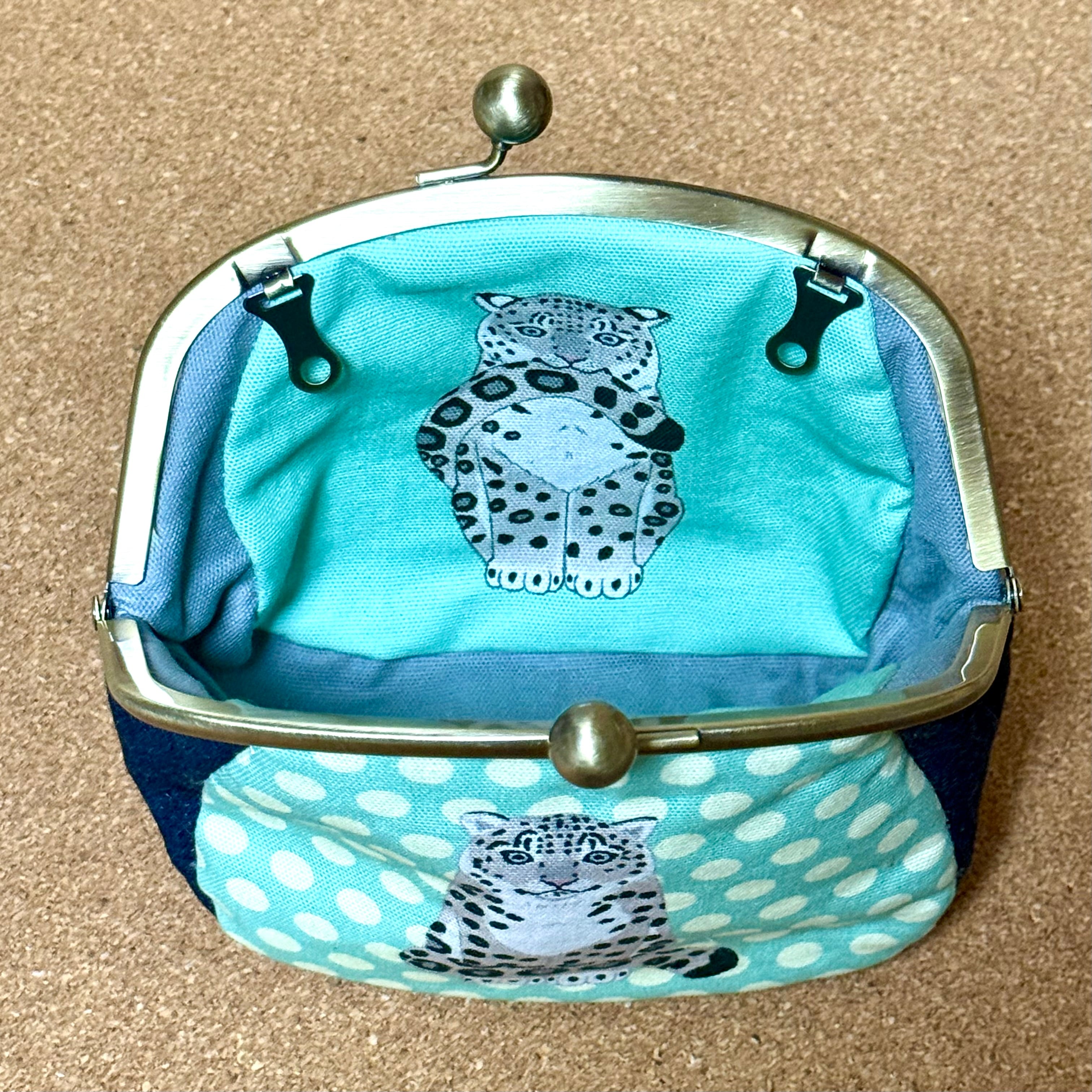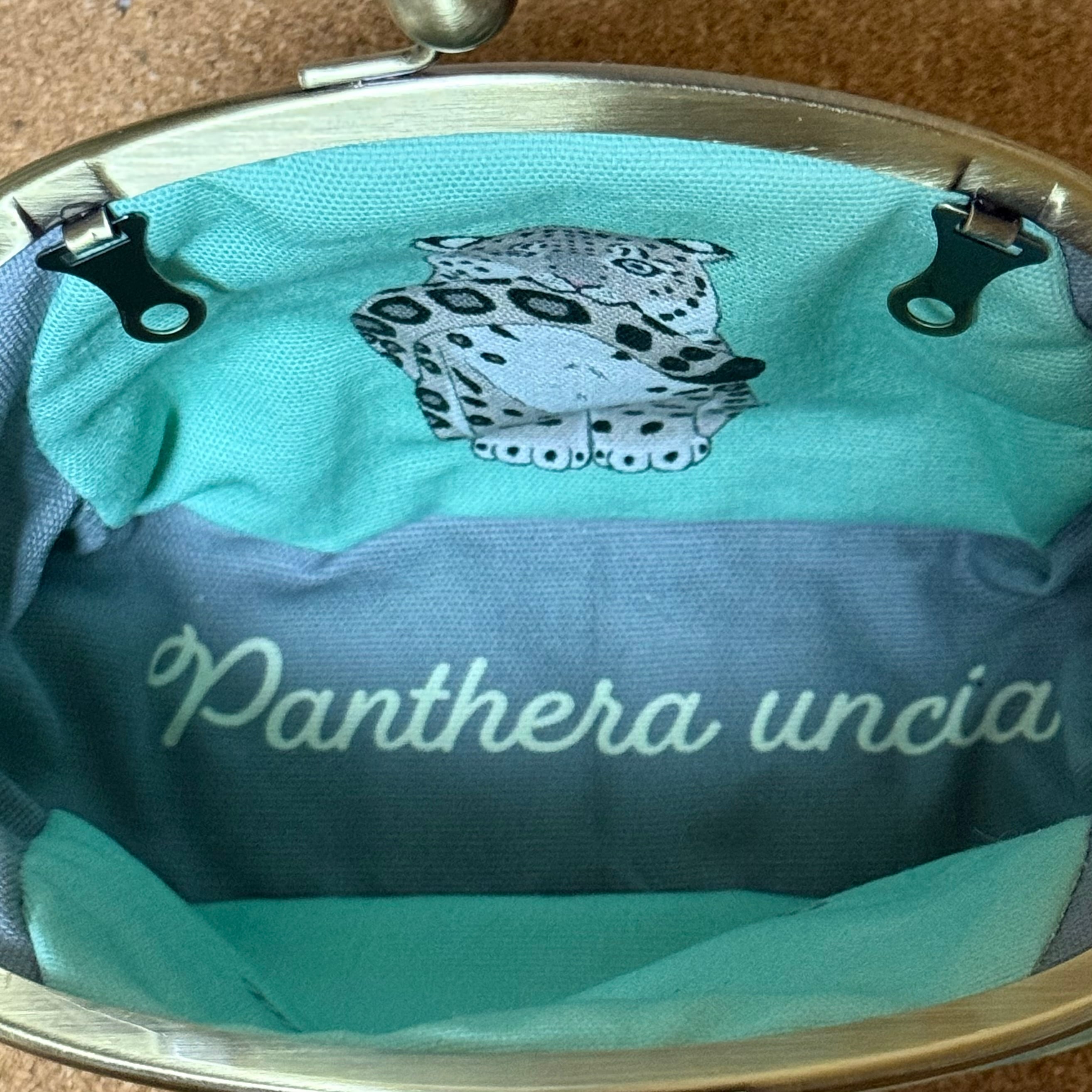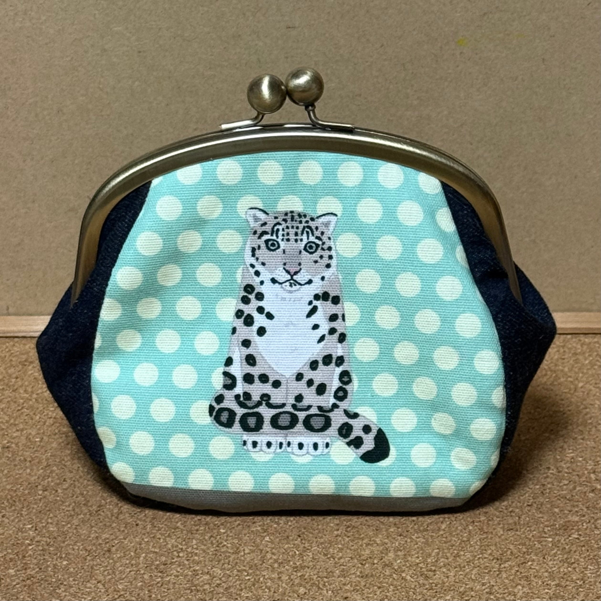 尾巻き座りのユキヒョウがま口を開くとしっぽを咥えたユキヒョウがいます。